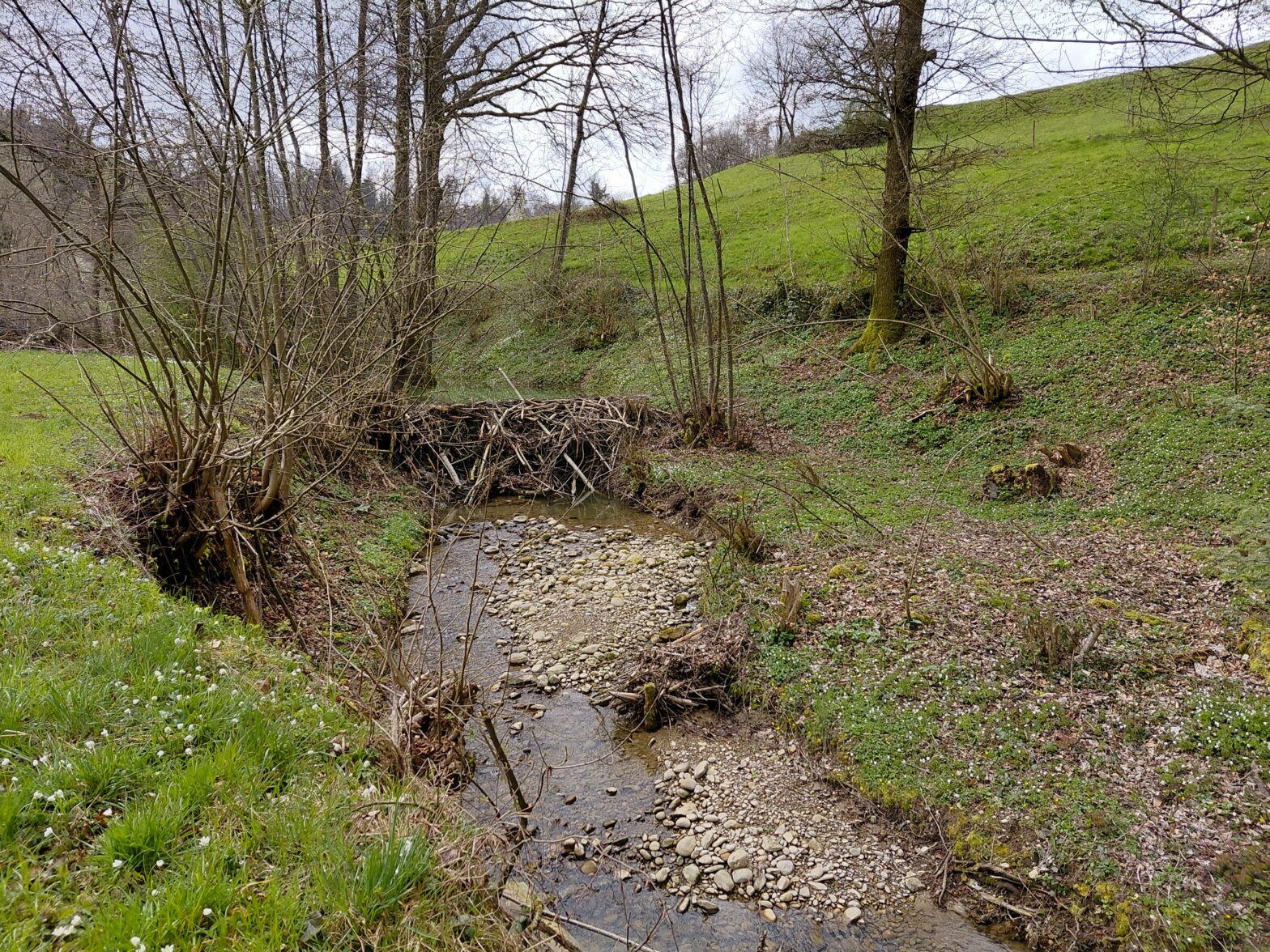Der Staudamm am Guntebach wächst. Er hat bereits eine Höhe von 1.50 Meter erreicht. Der Baumeister gibt sich alle Mühe.